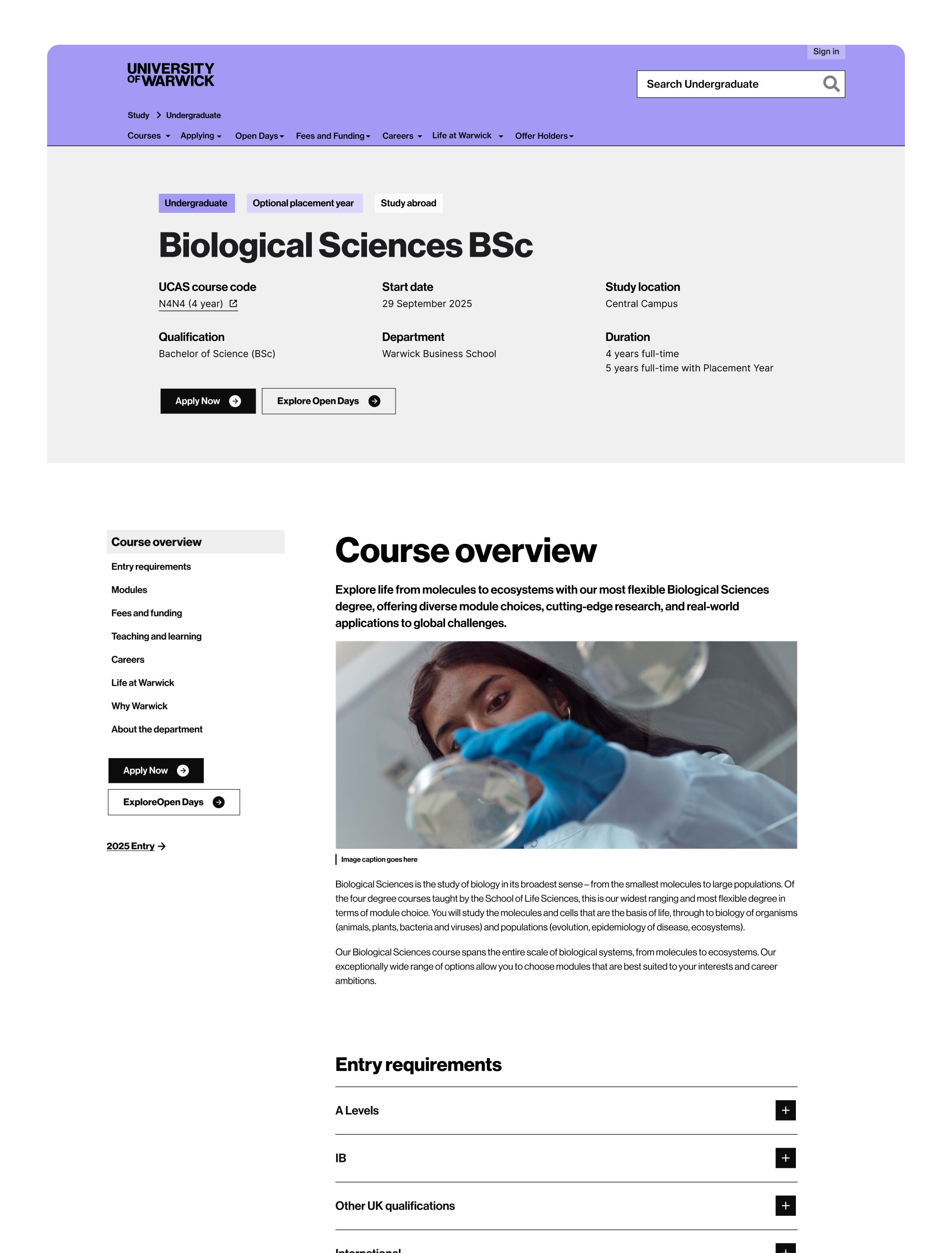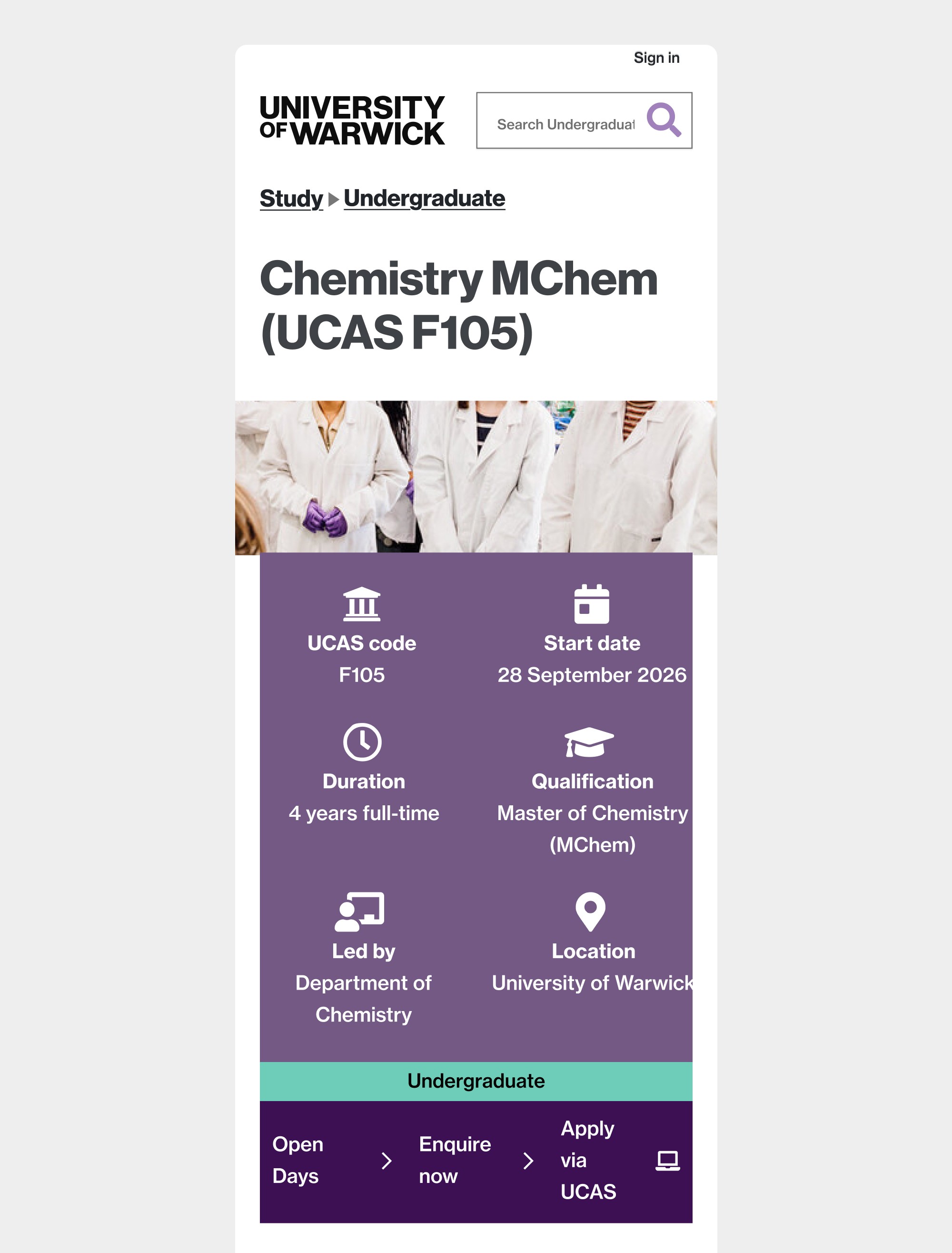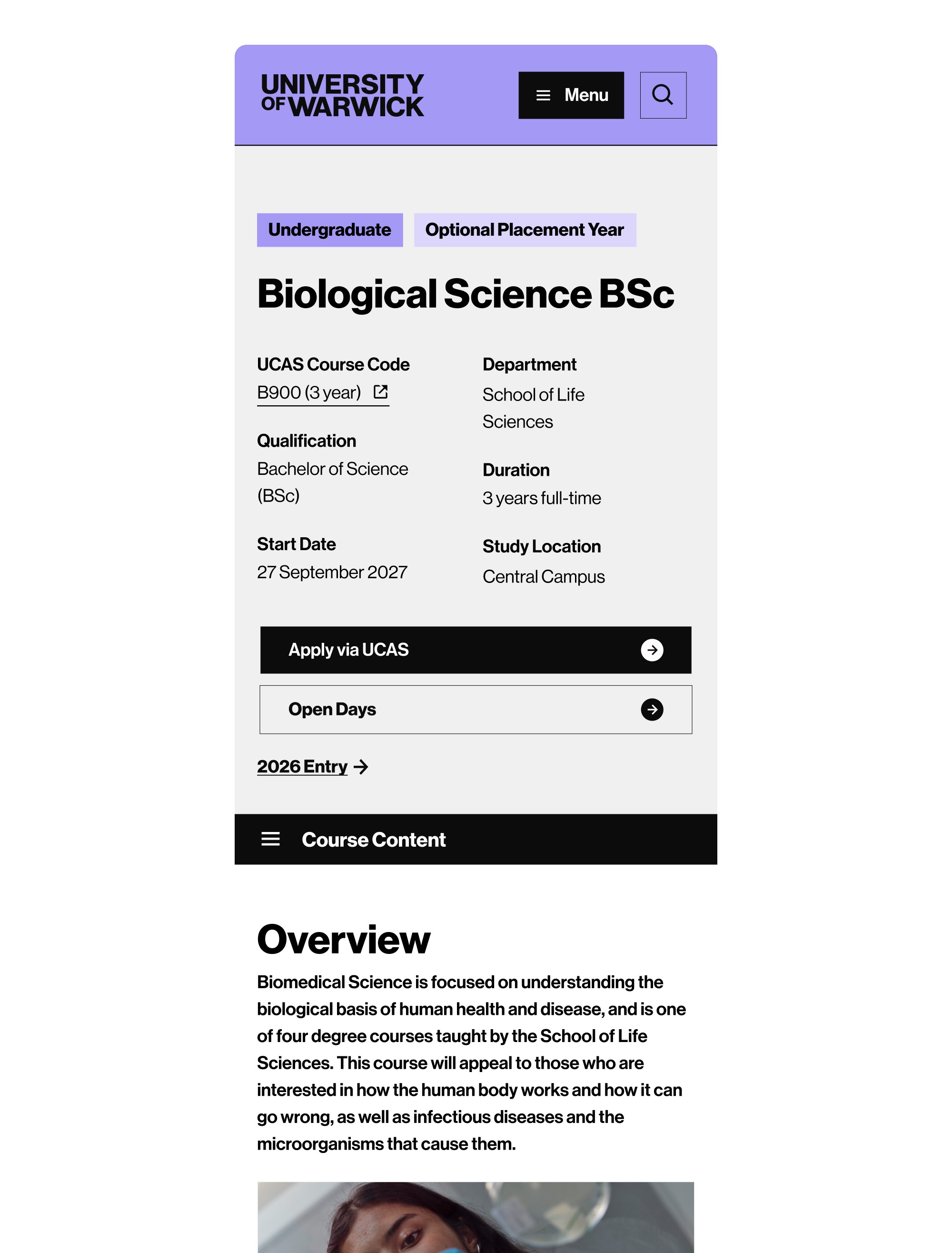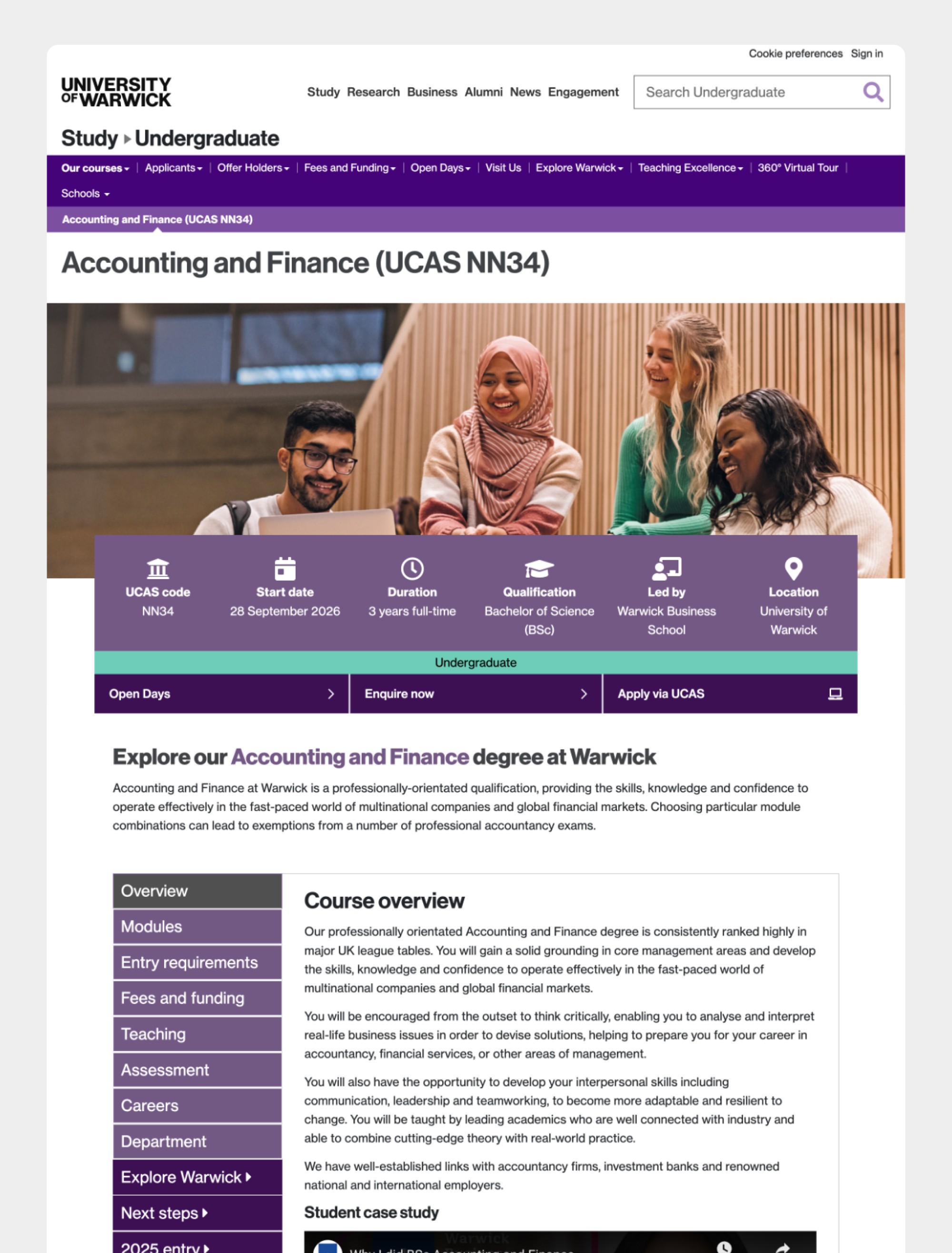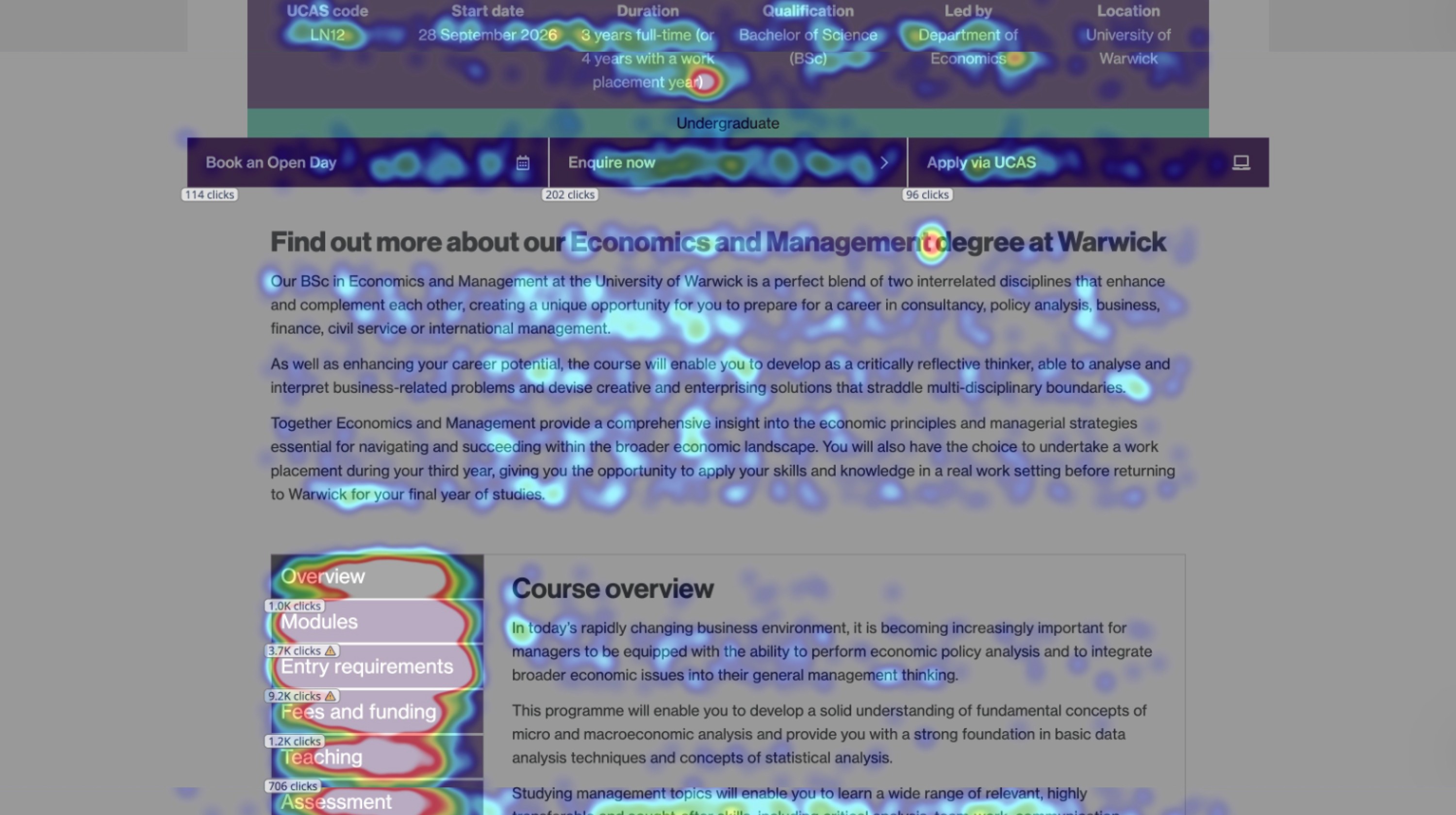 Warwick's undergraduate course pages attract 643,499 users and 2.1 million views annually, sitting at the centre of a recruitment pipeline tied to £438M in course fee income. Despite their commercial significance, the pages had not been meaningfully redesigned since 2020. This project delivered a complete template rebuild, grounded in data from 1,587 prospective students, with the goal of removing friction from the application journey and supporting the university's 2026/27 income targets.