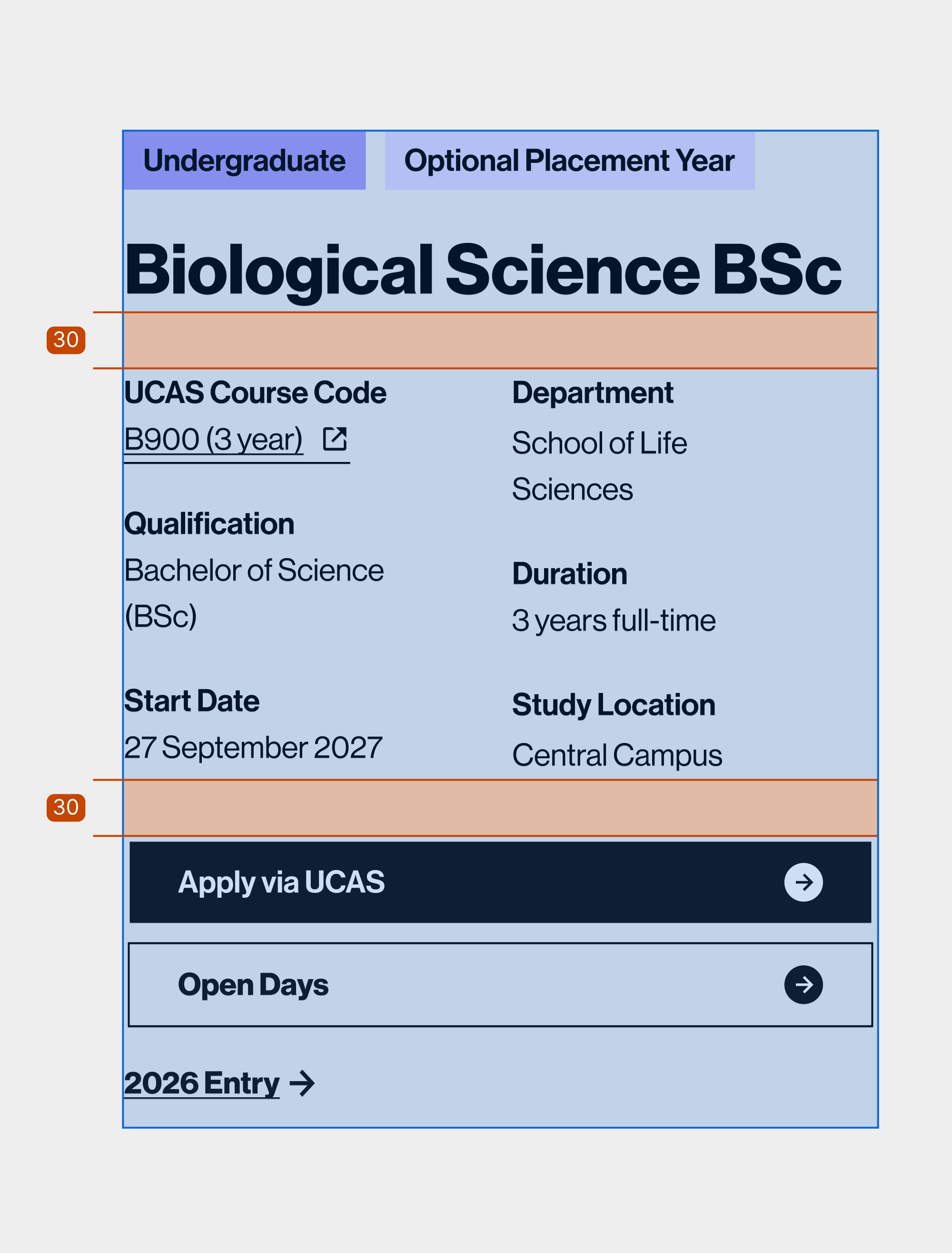 The redesign delivers the most significant improvement to the undergraduate course page experience in the programme's history. Critical course metadata is now visible above the fold, removing the need to scroll for basic facts. A sticky left-hand navigation allows users to jump to any section at any point, consistent with competitor patterns validated in research. Content column width has been constrained to the accessible 50–75 character range, the UCAS link now deep-links directly to individual course listings, and the full design is mobile-first across a user base that is 37% mobile.